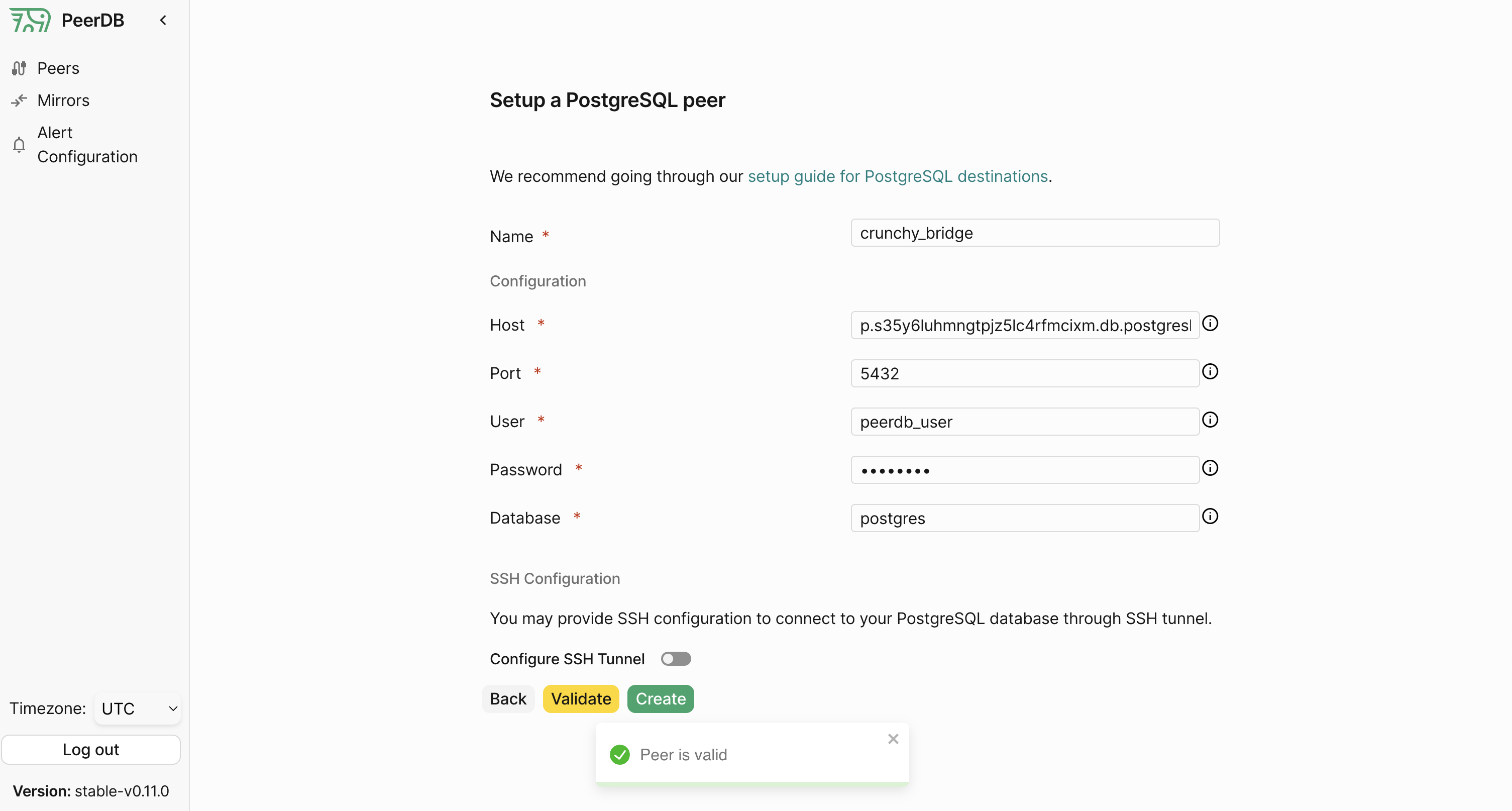 Through the PeerDB UI, create the Crunchy Bridge Postgres Peer using thepeerdb_user