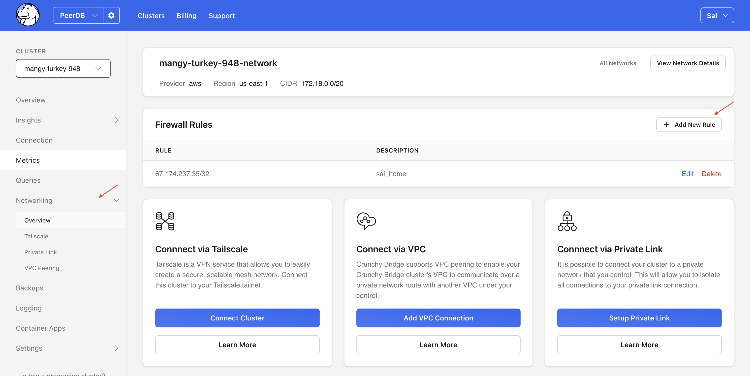 If you are using PeerDB Cloud safelist the public IPs of your PeerDB Cloud instance by adding the Firewall Rules in Crunchy Bridge.