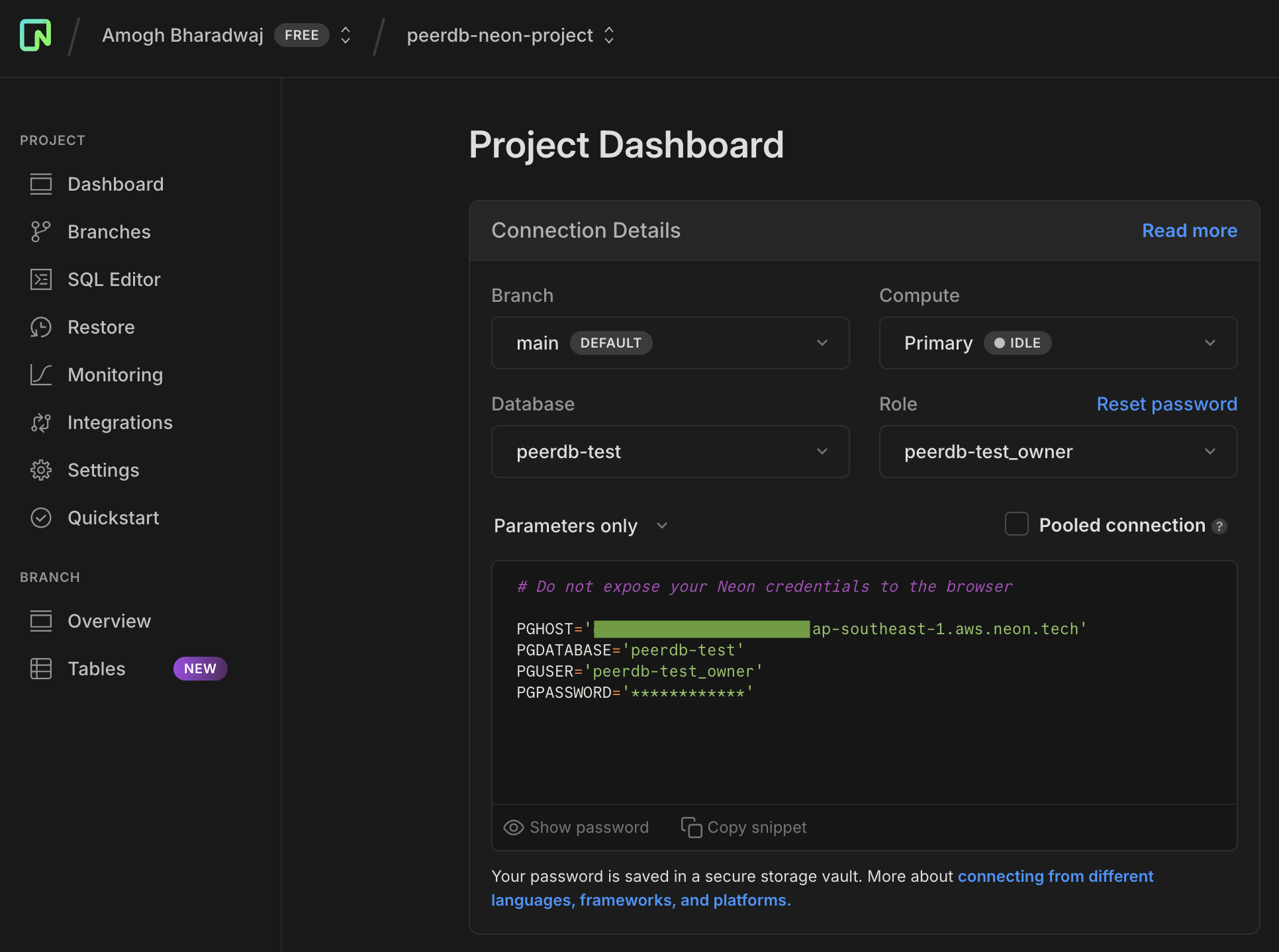 Now that we have the user, publication ready and replication enabled, we can copy the connection details to create a Neon Postgres peer in PeerDB. Head over to the Dashboard and at the text box where it shows the connection string, change the view to Parameters Only. We will need these parameters for our next step.