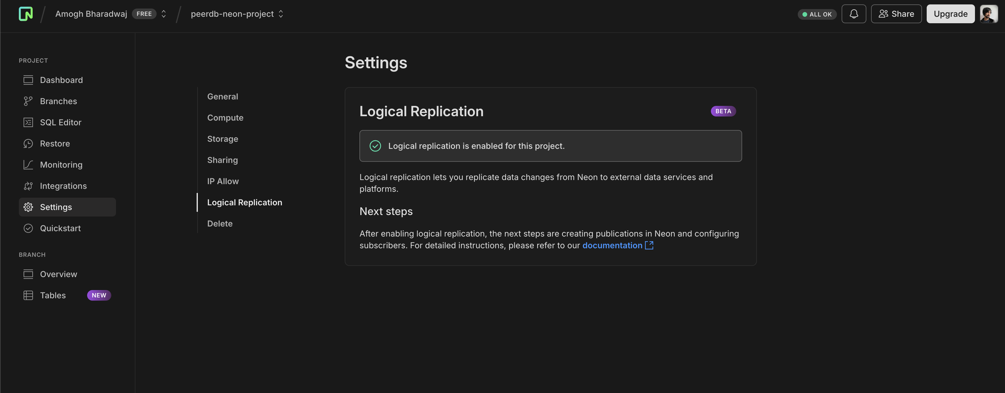If you have Neon Enterprise plan, you can whitelist the PeerDB Cloud IP addresses (or the equivalent for PeerDB OSS/Enterprise) to allow replication from PeerDB Cloud to your Neon Postgres instance. To do this you can click on the Settings tab and go to the IP Allow section.