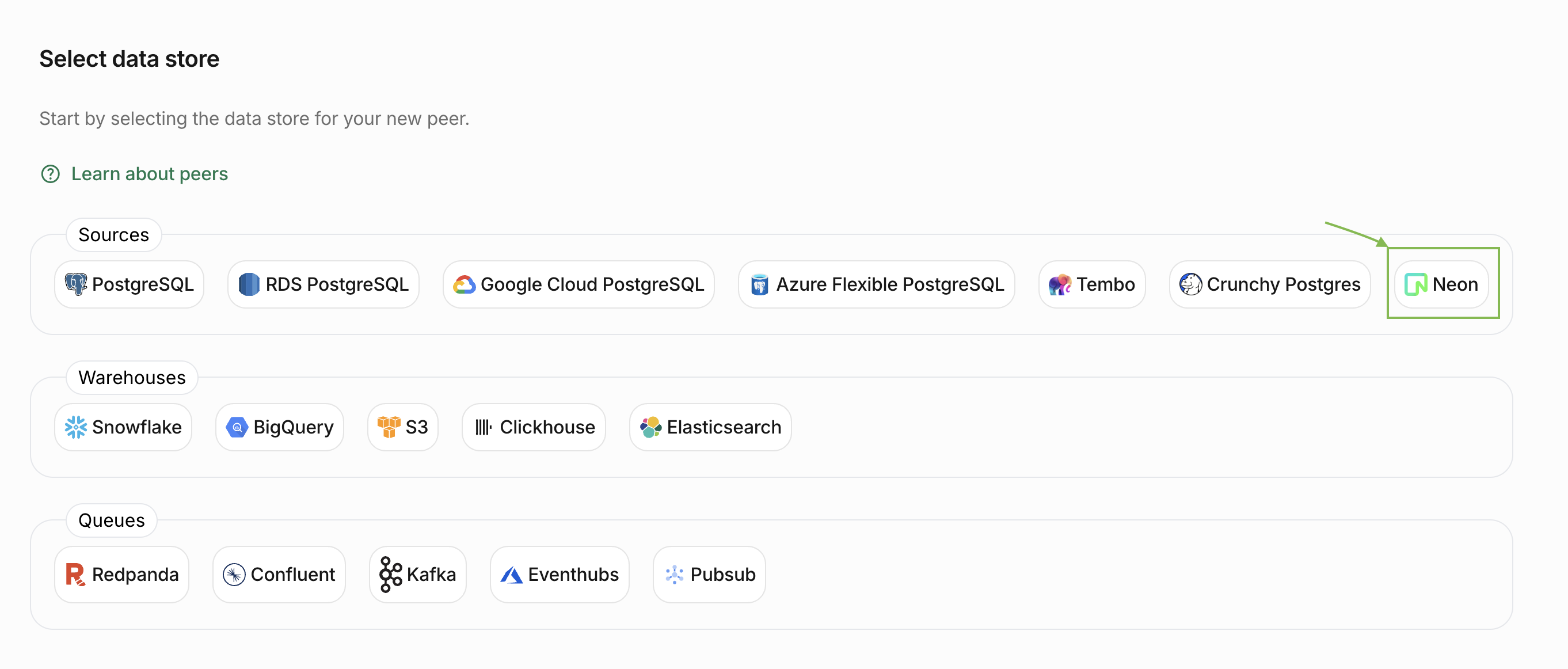 Now that we have the connection details, we can create a Neon Postgres peer in PeerDB. Head over to the PeerDB UI and click on Create Peer. Select Neon as the source.