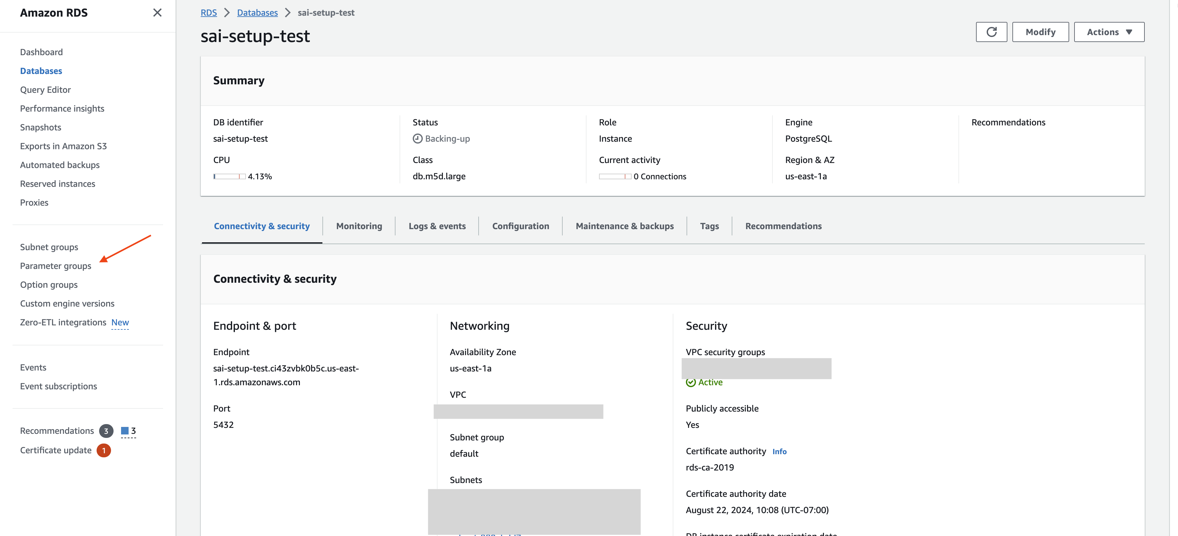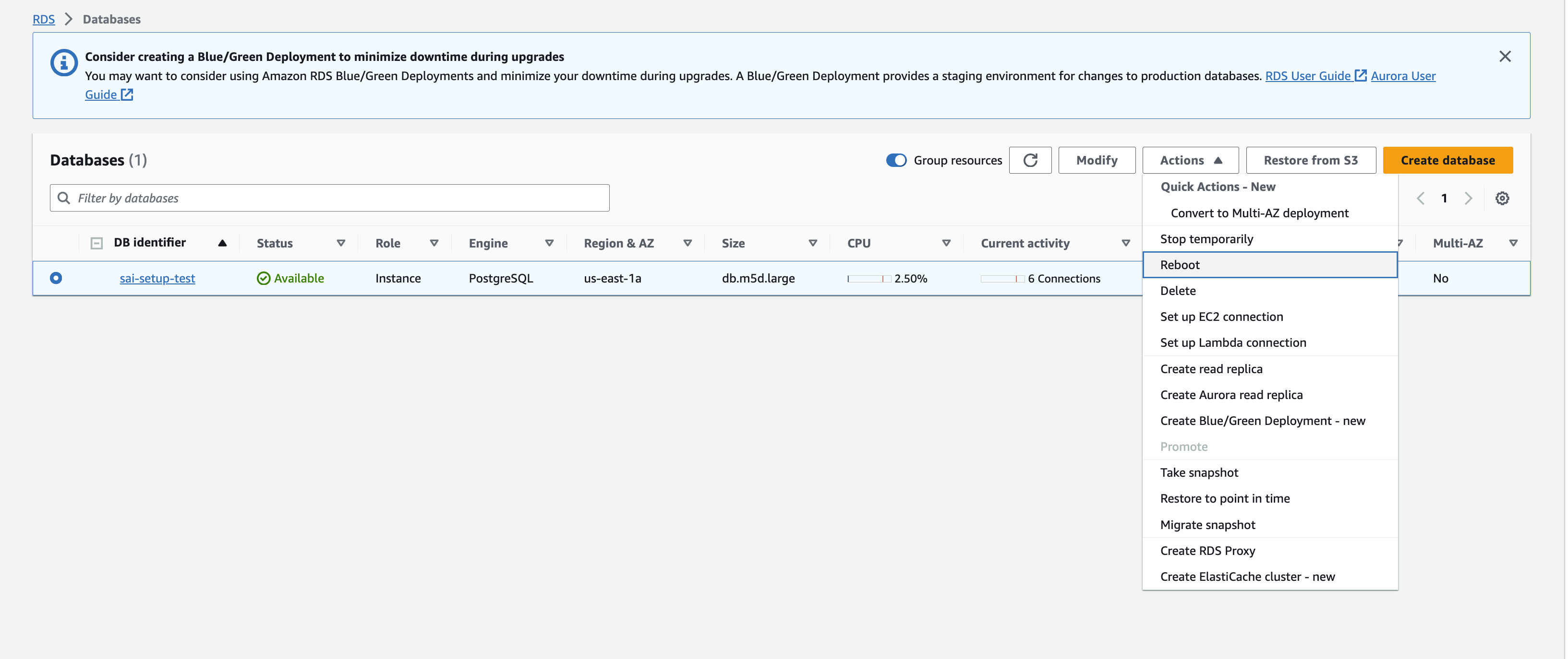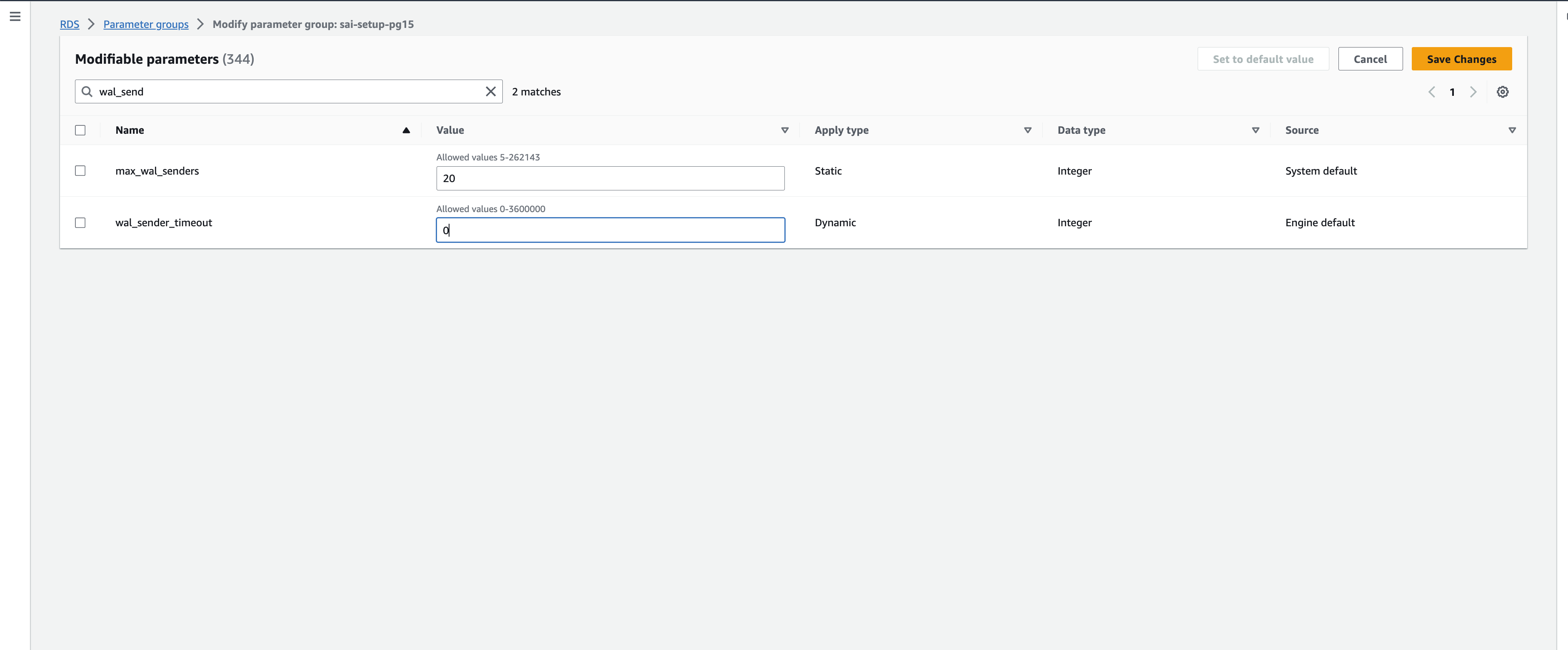 You don’t need to follow the below steps if the settingsrds.logical_replication is 1 and wal_sender_timeout is 0. These settings should mostly be pre-configured if you are migrating from another data replication tool.