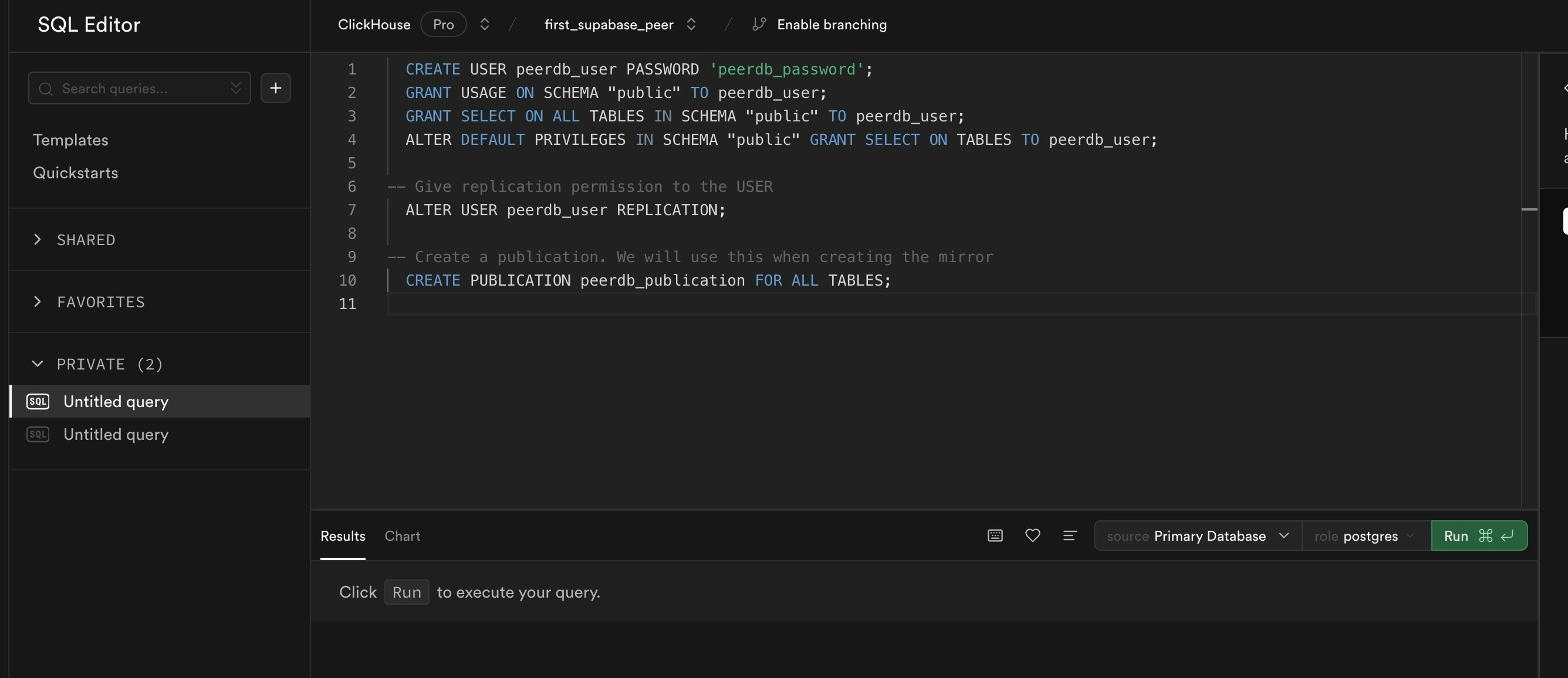 and also create a publication that we’ll use for replication.For this, you can head over to the SQL Editor for your Supabase Project.