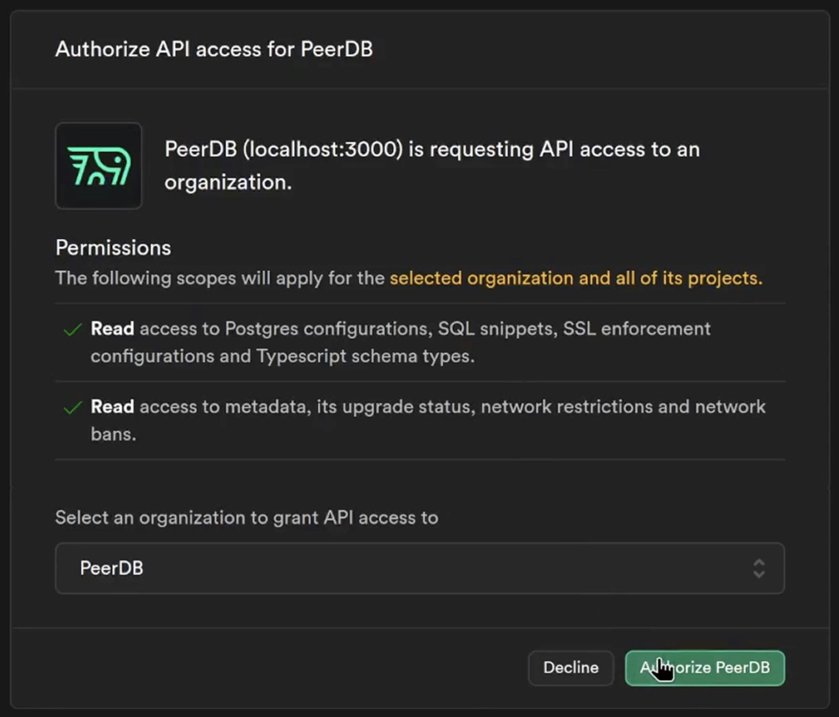 - You should be redirected to Supabase to authorize PeerDB to access your Supabase Project. Make sure to select the correct organization from the dropdown and click on Authorize PeerDB.