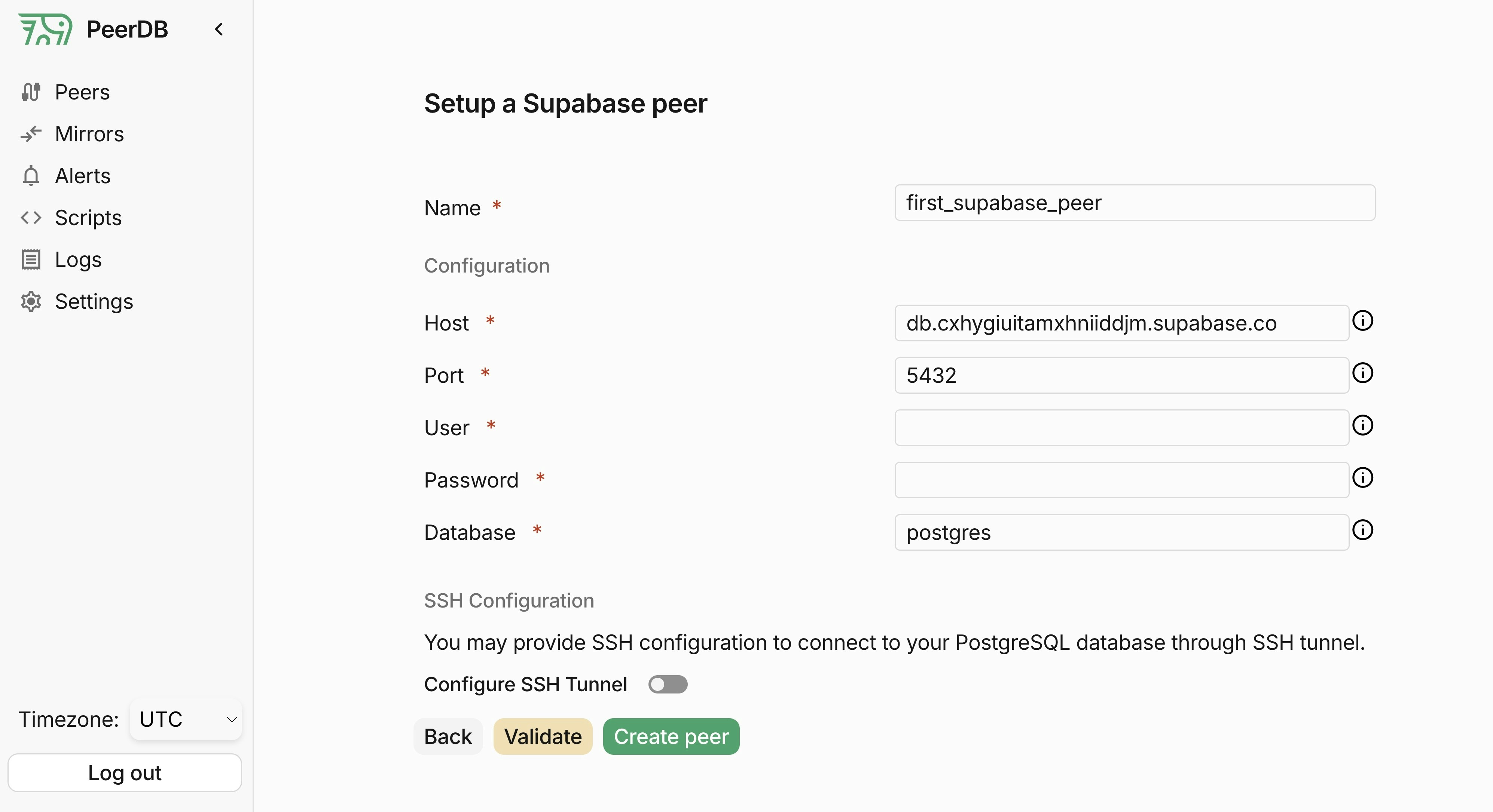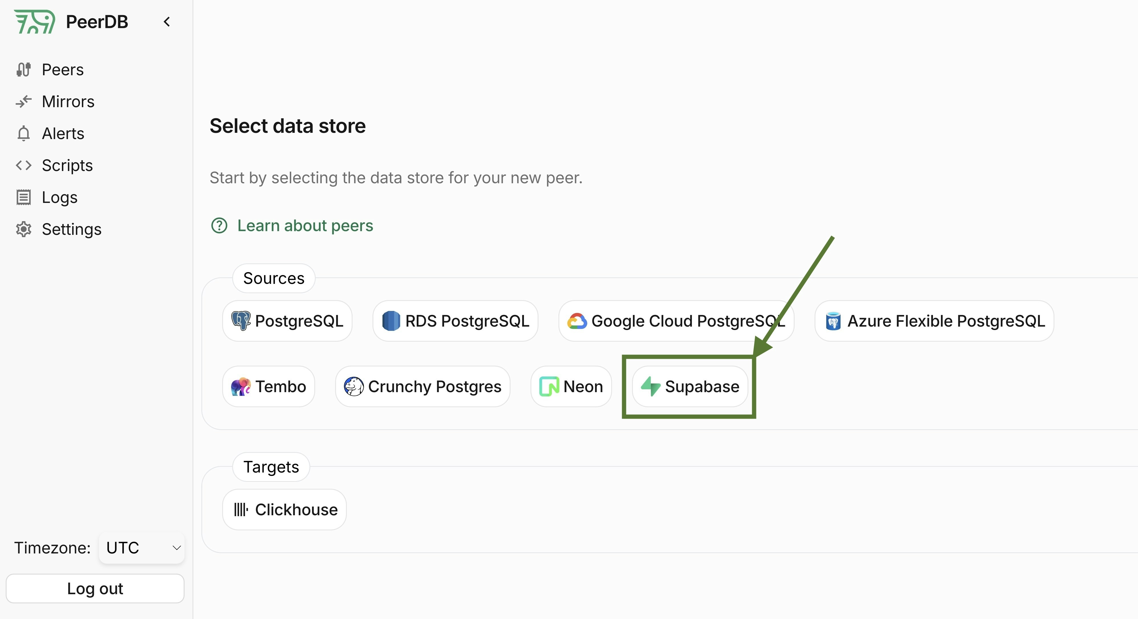 - Head over to the PeerDB UI and click on Create Peer. Select Supabase as the source.